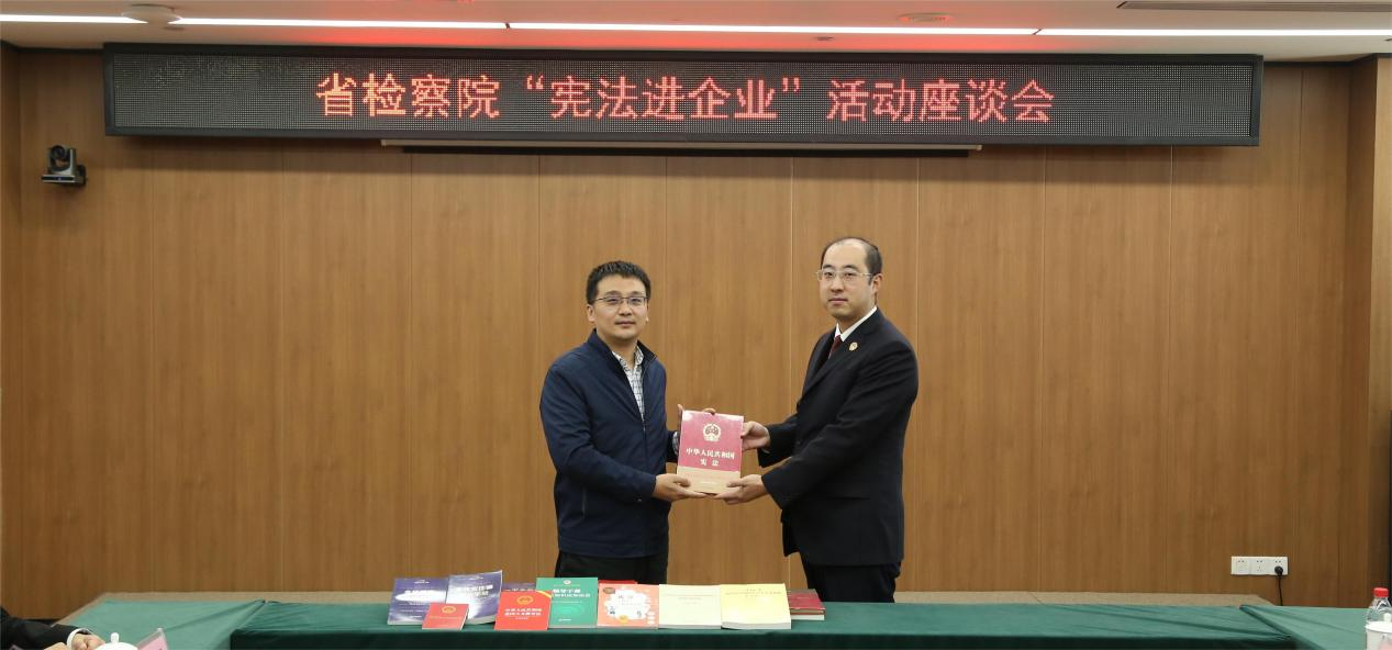 ????隨后,省檢察院一行與長江科服開展贈書活動并座談交流。楊思哲向長江科服代表徐東贈送憲法、安全生產法等相關書籍,他表示長江科服在法治建設及宣傳教育工作方面有良好的基礎,希望雙方可以在知識產權保護方面積極開展交流,通過法律方式為企業(yè)保駕護航,保障企業(yè)合法經營權益。